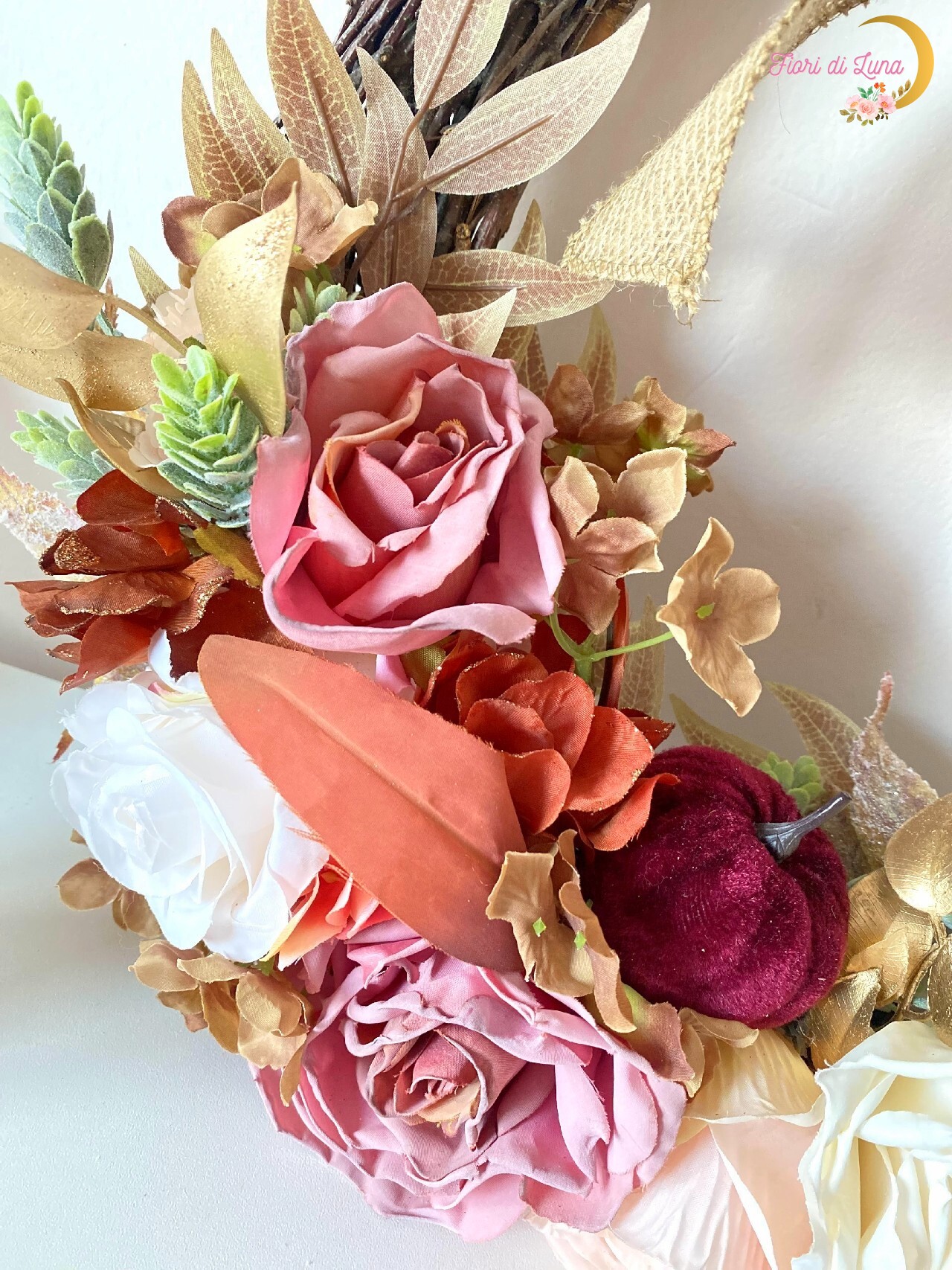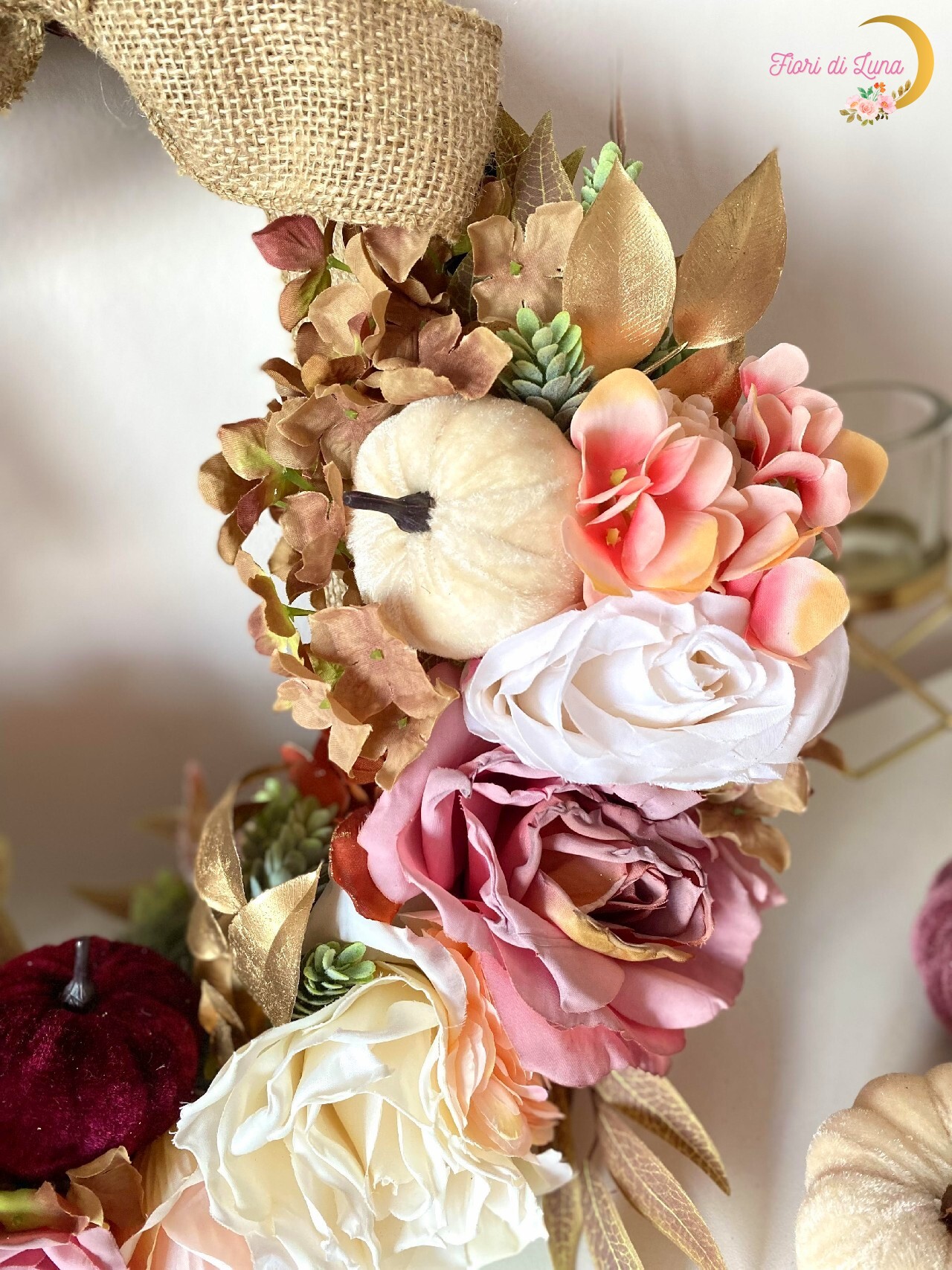 Jesenný veniec so saténovými tekvicami, kvetmi, dekoračnou zeleňou, jutovou stuhou. Základ vŕbové prútie. Súčasťou venca je aj stuha na zavesenie.